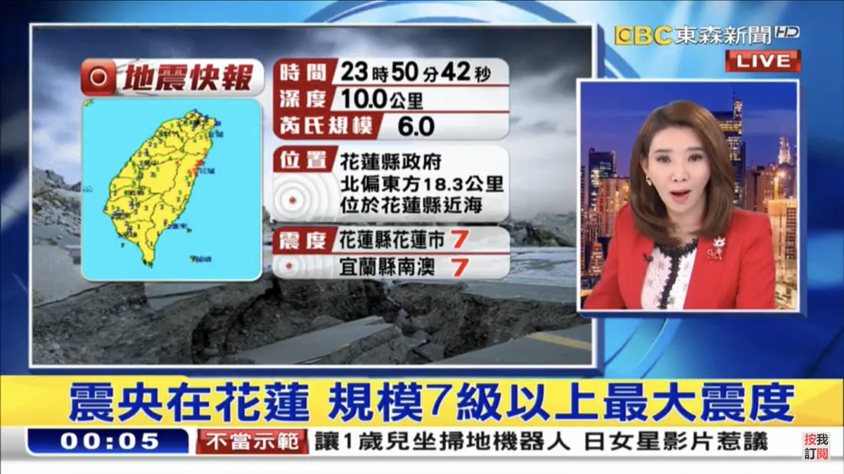 日本時間午前0時50分頃台湾東部でマグニチュード6.3の大きな地震。沖縄県でも揺れ。台湾東部花蓮県などでは最大震度7(現地基準)を観測。(JX通信社/FASTALERT)