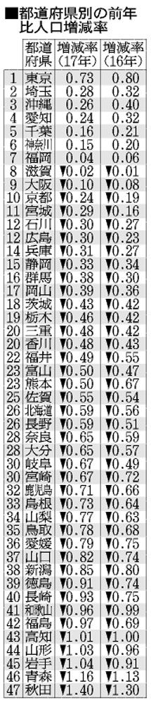 都道府県別でみると、東京圏への一極集中が続く。東京、埼玉、千葉、神奈川の1都3県は人口増加率がいずれも6位以内。東京の増加率は0・73%で前年の0・80%より緩やかになったが、人口の増加は止まっていない。