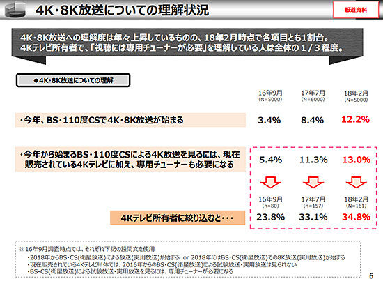 調査を実施したのは、4K/8K放送などの普及を推進する放送サービス高度化推進協会(A-PAB)。A-PABでは、過去にも同じ調査を行っており、2016年9月時点の理解度が5.4%、17年7月時点での理解度が11.3%だった。少しずつ認知が広がっているものの、本放送が始まる年になってもまだ1割強というのは心もとない。