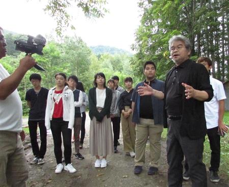 宮本編集委員の説明を聞く学生ら=21日、北海道赤井川村