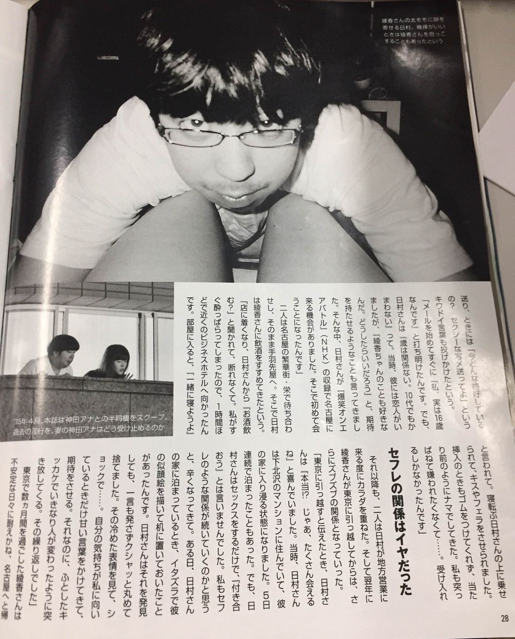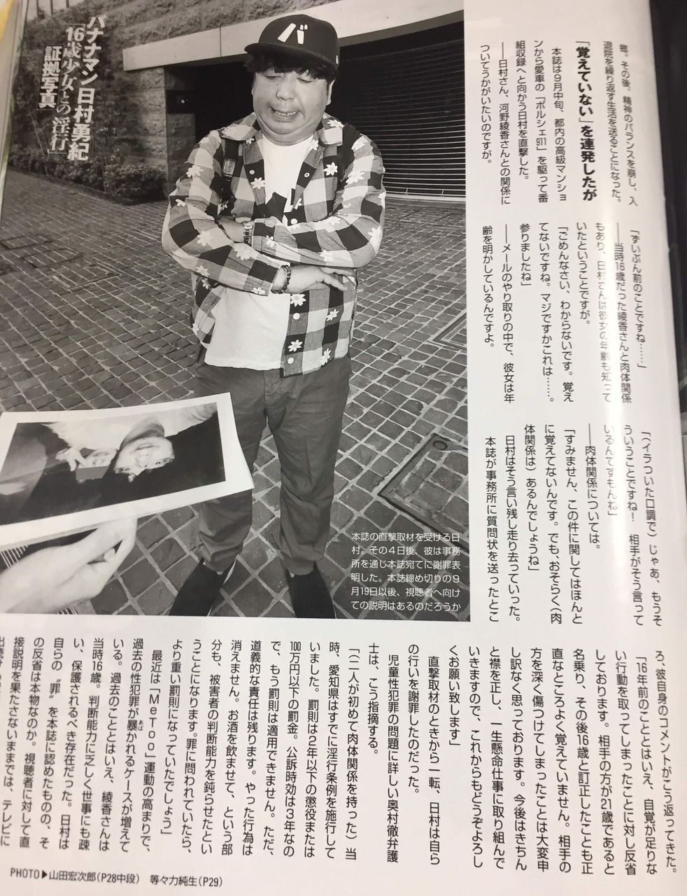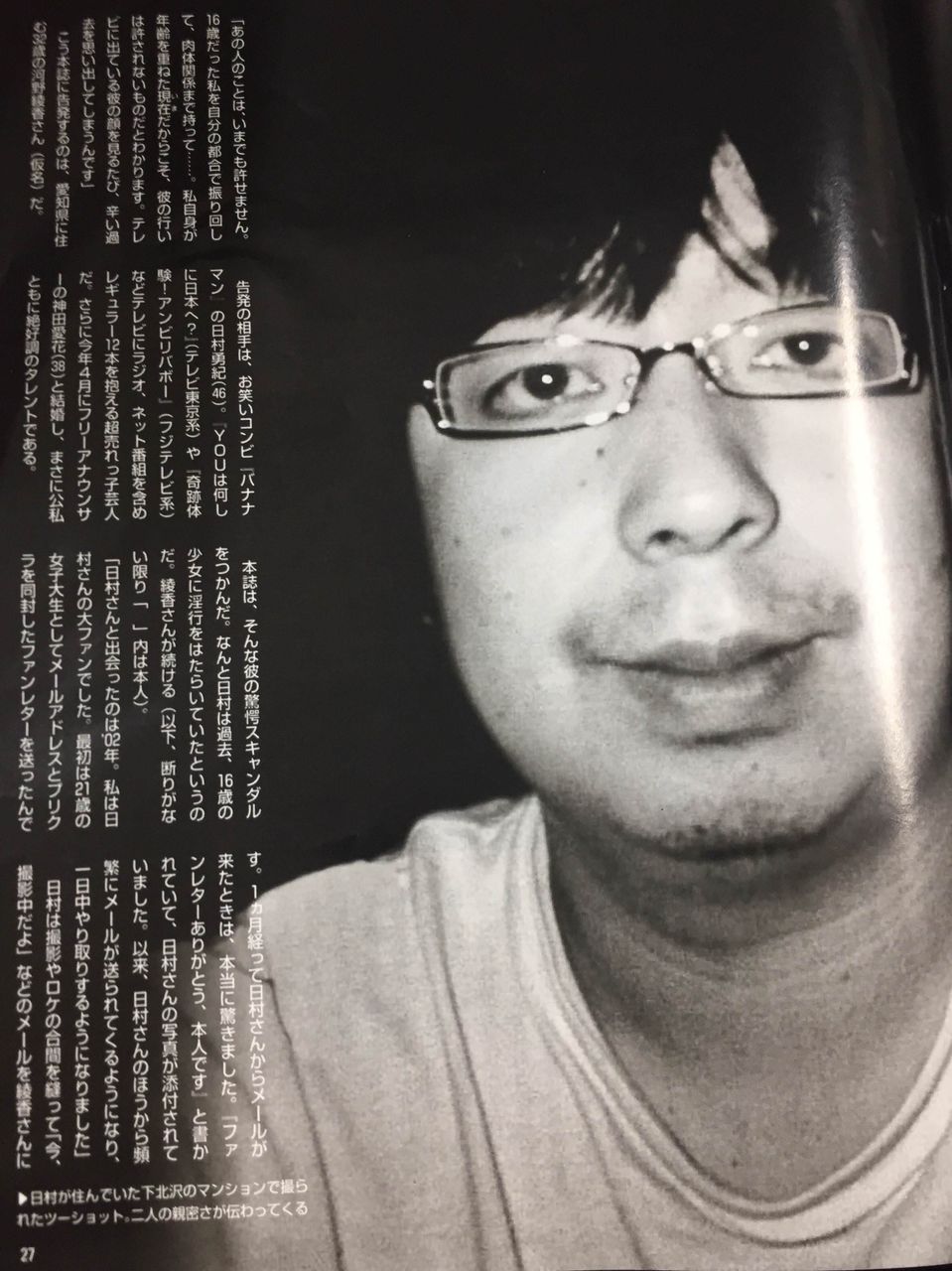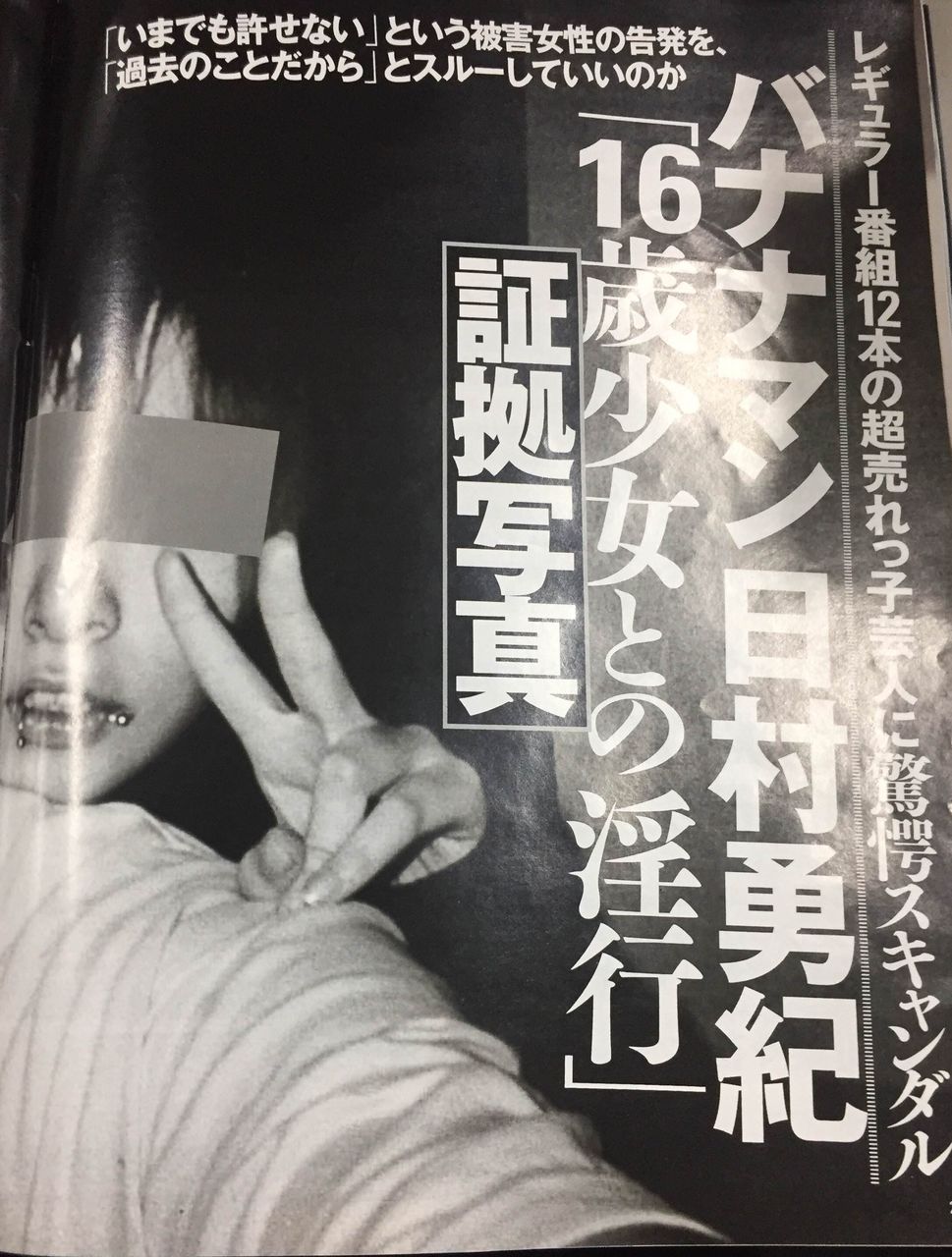 表紙には「バナナマン日村勇紀 『16歳少女との淫行』証拠写真 今でも許せないという被害女性が衝撃告発」と書かれている。
