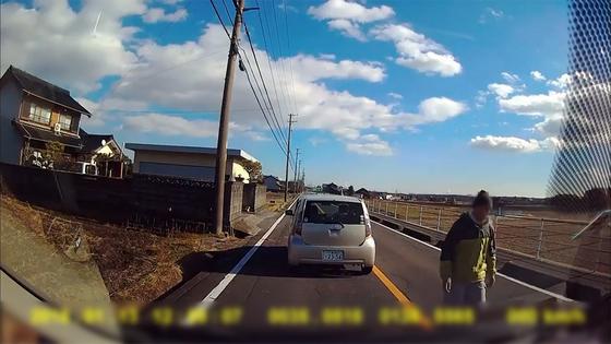 すると突然、後ろから、反対車線に大きく膨らんで追い越してきた1台の車が、道路をふさいで停止。