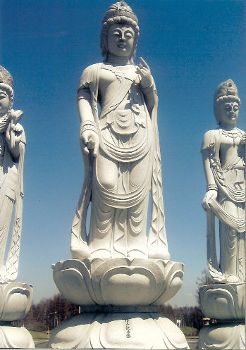 その後方には3体の巨大な観音像がそびえている。そして、石碑の説明文の最後には寄贈者として故・安倍晋太郎元外相の妻との説明つきで安倍洋子夫人の名前が、また、中央のもっとも大きな