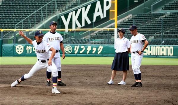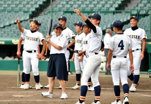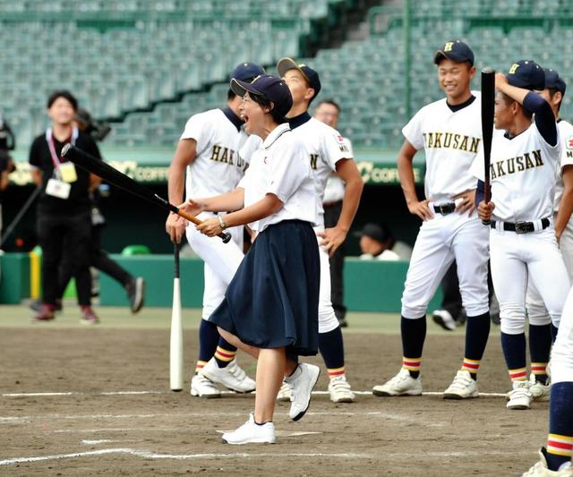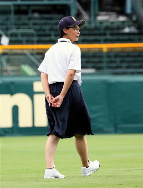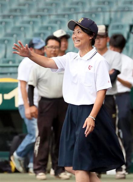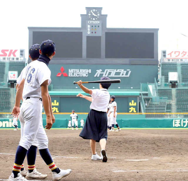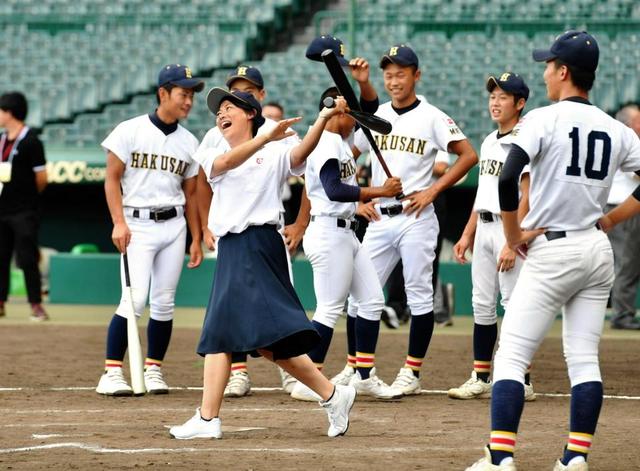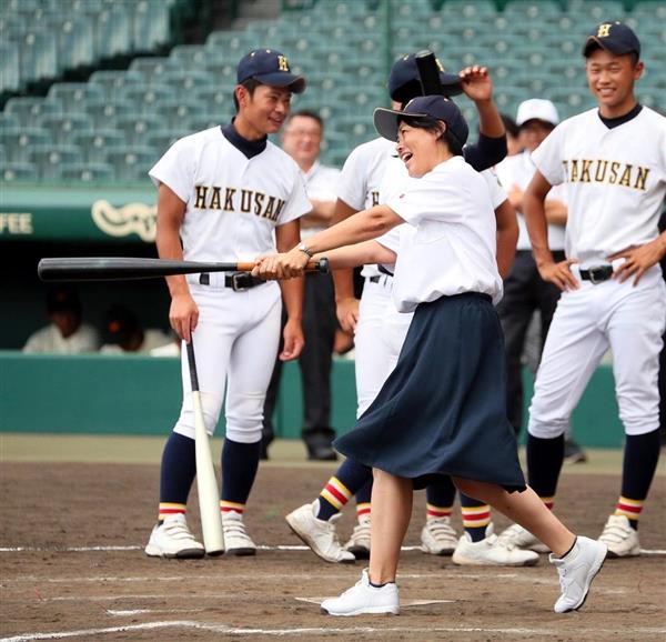 例年の甲子園練習が、今大会は56校と出場校が多く、甲子園見学に切り替えられた。選手たちはグラウンドを見学し、ボールを使わずにボール回しのふりやシャドーピッチをする中、それまで選手たちを見守っていた川本部長は、ナインや東拓司監督(31)から招かれるようにグラウンドへ。白いポロシャツに紺のスカート、野球帽姿で右打席に入り1回スイングをしてみせた。チーム全員は大喜びだったが、すぐに大会関係者に制止、注意を受けた。