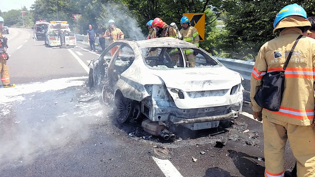 韓国北東部・江原道の高速道路で炎上したBMWの乗用車=2日、江原地方警察庁提供