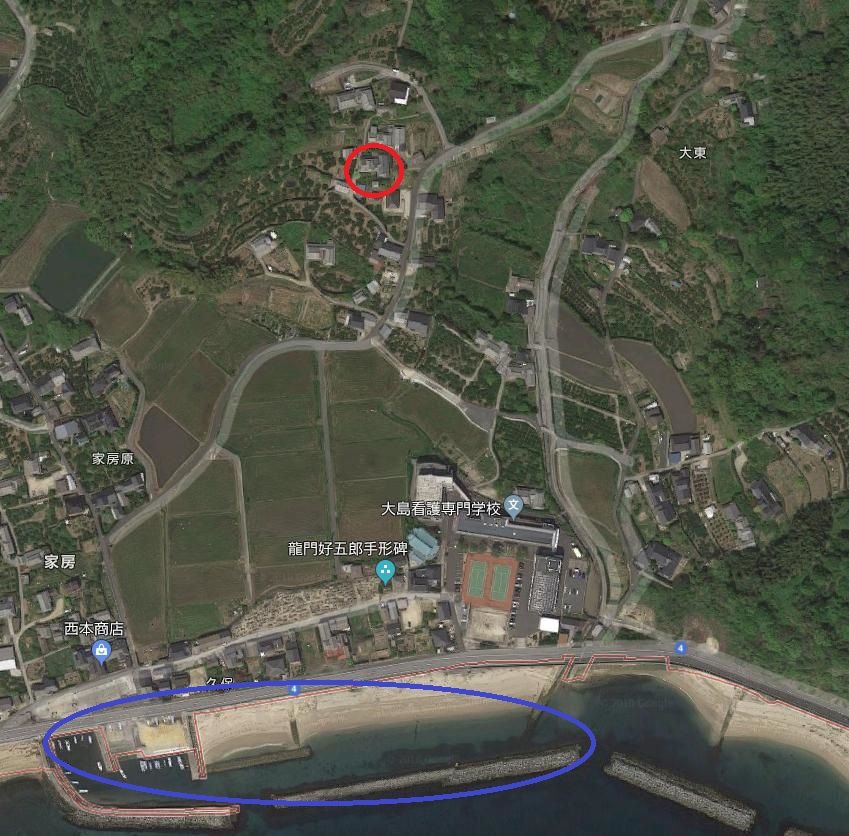 赤丸:曽祖父宅、青丸:目的地の海岸、紫丸:藤本理稀くんが一人で歩いた坂道、オレンジ丸:藤本理稀くんたちと母親が最初に通った道