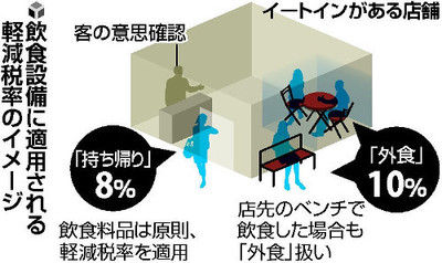 答えた場合は「外食」扱いになり、10%の税率を課す。税率を8%に据え置く軽減税率の対象にはならない。