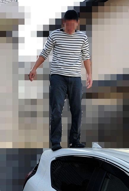 男性教員が所有する車の上に乗る加害側の教員(提供写真、画像の一部を加工しています)