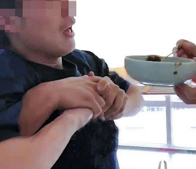 羽交い締めにされて激辛カレーを無理やり食べさせられる男性教員(提供写真、画像の一部を加工しています)